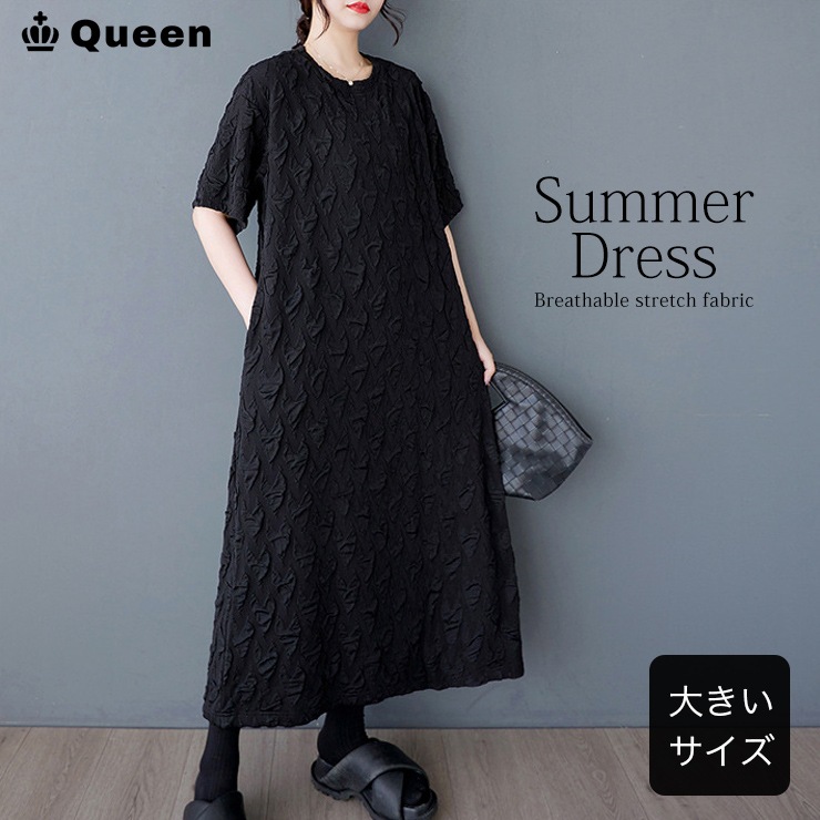 大きいサイズ レディース ワンピース 半袖 リップル ブラックワンピ お洒落 ストレッチ 無地 高見え 夏 (595215)