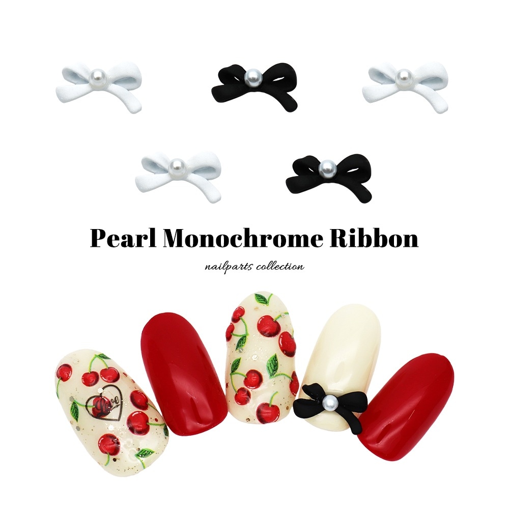 【ネコポス送料無料】ネイルパーツ パール付きモノクロリボンパーツ [ブラック 黒/ホワイト 白] 全2色 3個入り