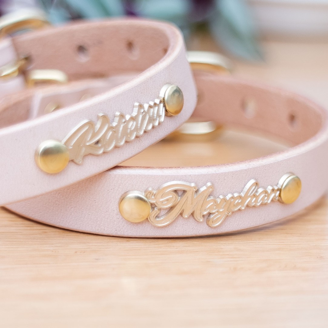 プチサイズの立体彫刻ネームプレート付首輪 おなまえ首輪 本ヌメ革/本革 手仕上げ 真鍮金具 首輪(小型犬・中型犬) A1005