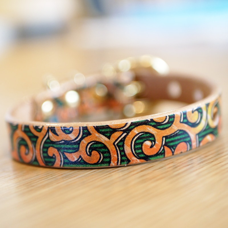 Framer アートなグラフィック本革首輪 ポップな唐草模様 グリーン 真鍮無垢金具 サイズSS~L ベルト幅16mm #2346...