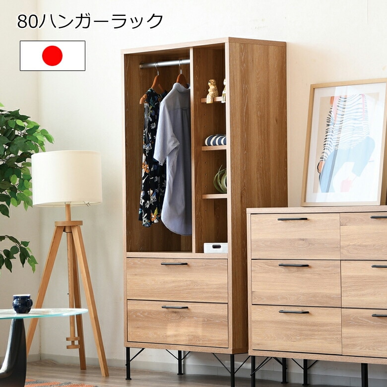 80ハンガーラック 洋服掛け リビング収納 引き出し付き 棚付き アイアン脚 北欧 引出しフルオープンレール付き 完成品 日本製