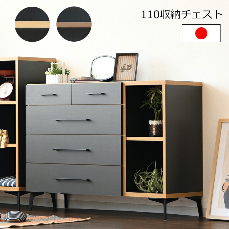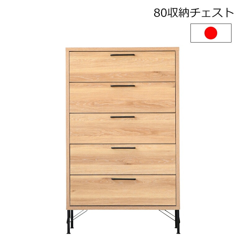 80-5段チェスト 幅80cm 引出しフルオープンレール付き アイアン脚 リビング収納 寝室 完成品 日本製