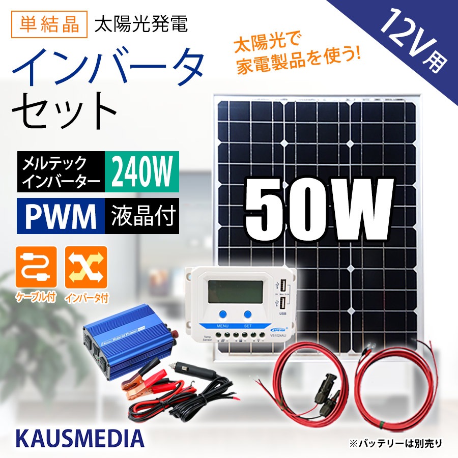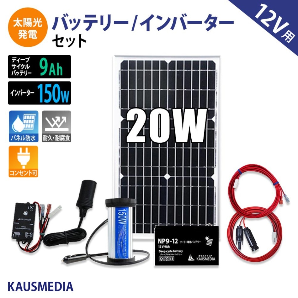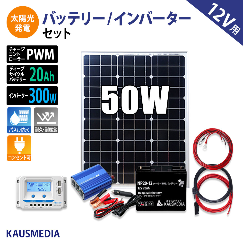 50W ソーラーパネル 蓄電池 300Wインバータ バッテリーセット 12V 20Ah ソーラー充電