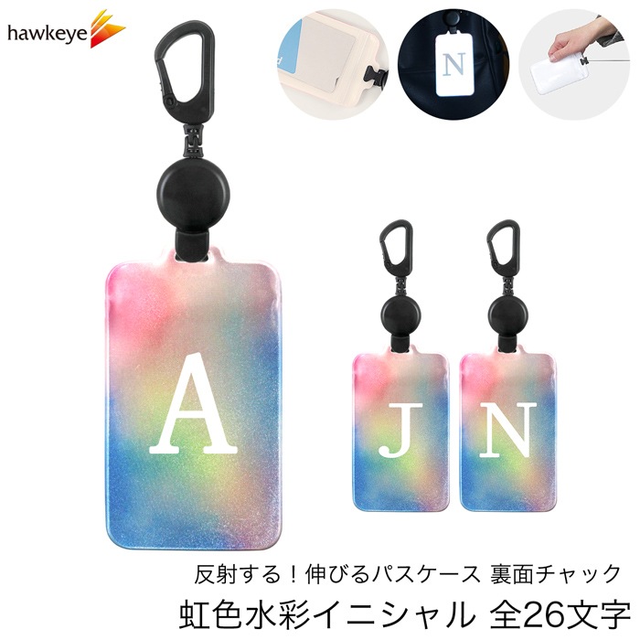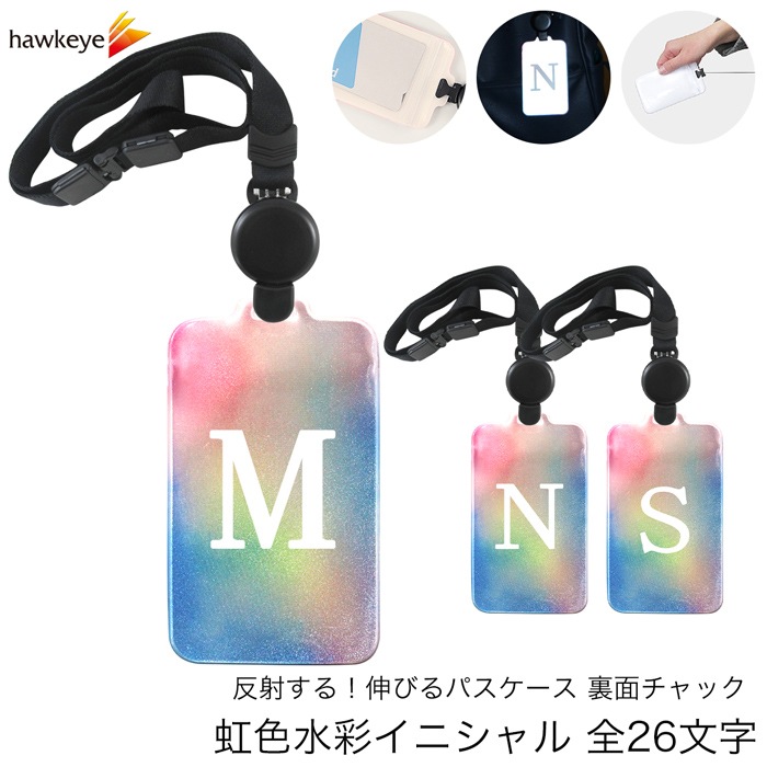 虹色水彩イニシャル/のびパス 光に反射する パスケース 伸びるリール付き 選べるイニシャル