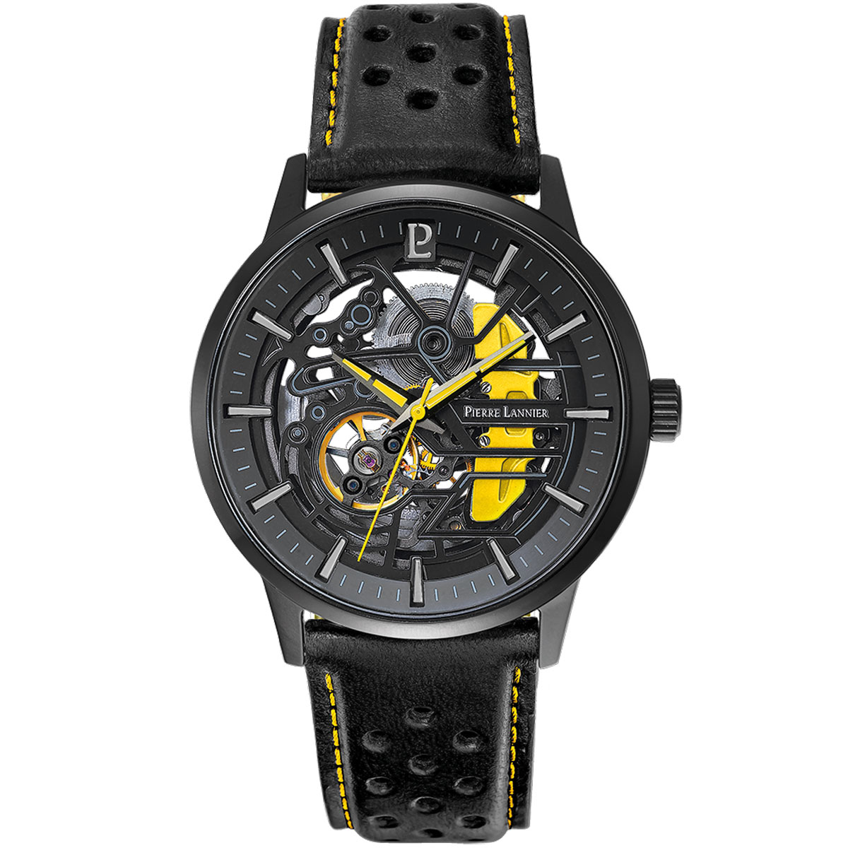 PADDOCK パドック 43mm 自動巻き メンズ 腕時計 スケルトン 革ベルト パンチングレザー イエロー ブラック