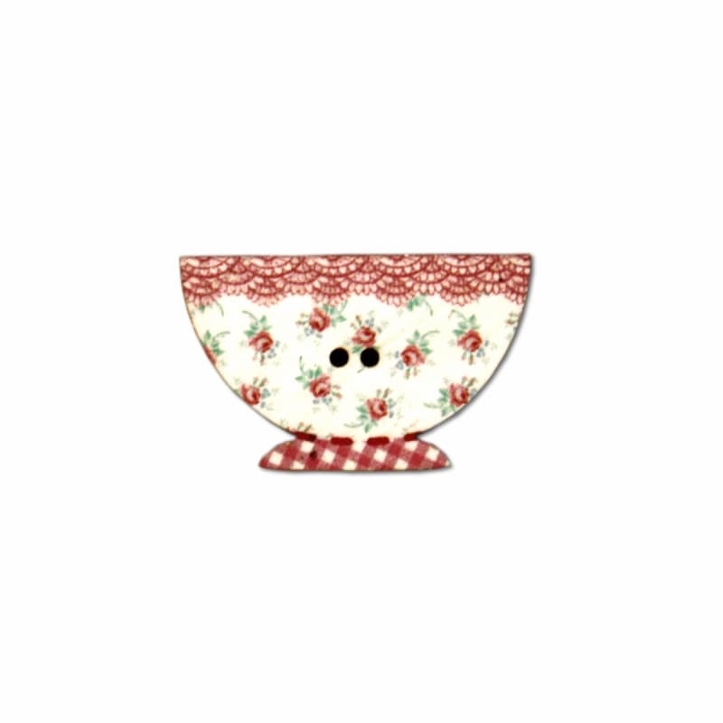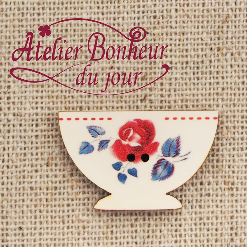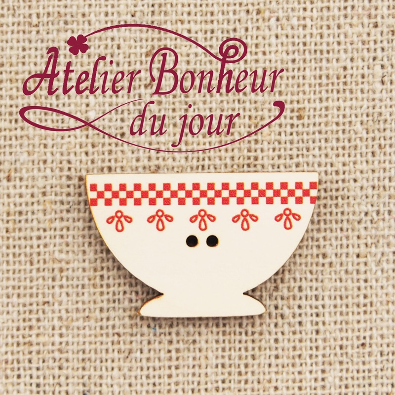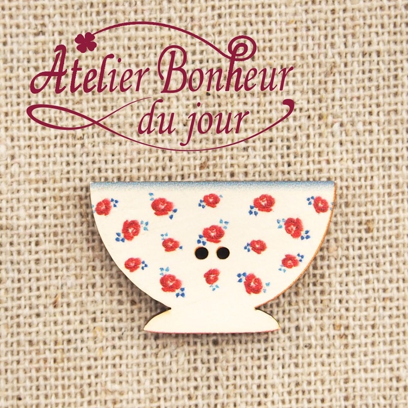 フランス製 木製ボタン 2つ穴 (ティーカップ×赤い水玉) アトリエ・ボヌール・ドゥ・ジュール
