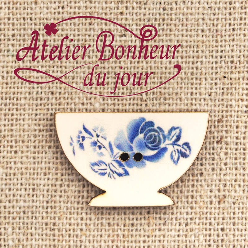 フランス製 木製ボタン 2つ穴 (ティーカップ×青い水玉) アトリエ・ボヌール・ドゥ・ジュール