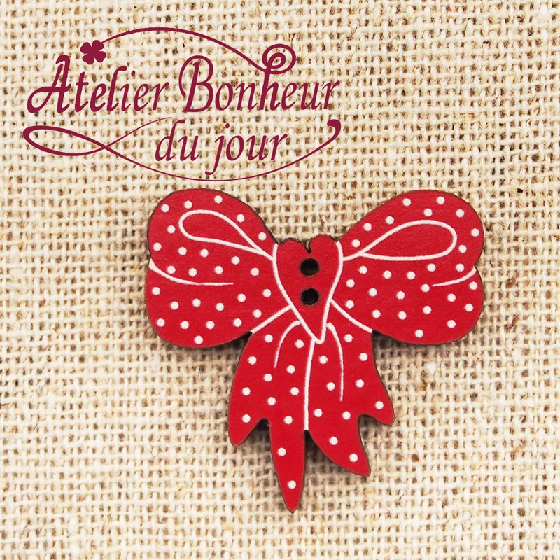 フランス製 木製ボタン 2つ穴 (リボン×ドット×ルージュ) アトリエ・ボヌール・ドゥ・ジュール