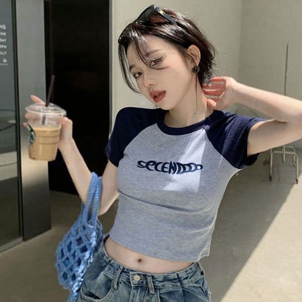 【セール】即納 安い レディース Tシャツ ラグラン 半袖 ロゴ クロップド丈 へそ出し スリム トップス ラグランT Y2K ス...