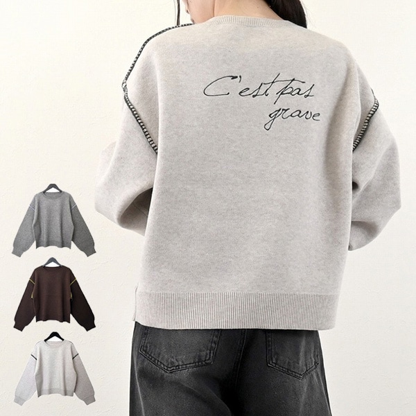 配色ステッチニットバックロゴ刺繍プルオーバー