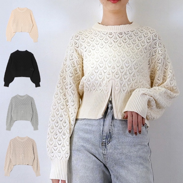 透かし編みニットフロントジップスリットプルオーバー