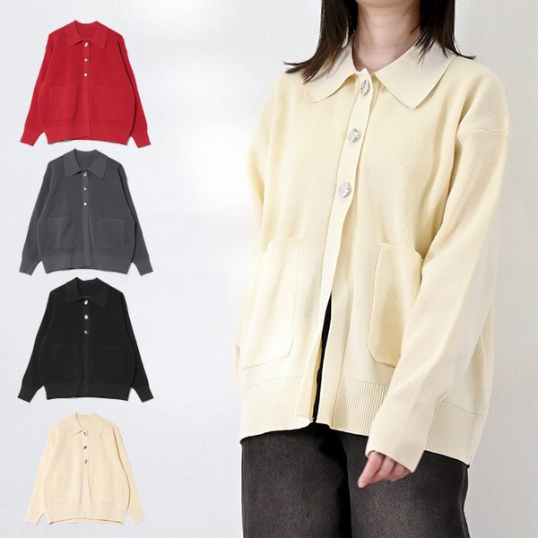 ポリウーリーメタルボタン襟付きニットカーディガン