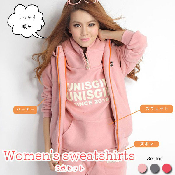 【即納】レディース スウェット 3点セット フリース素材 ジャージ フード付き パーカー 吸汗速乾性 スポーツウェア 部屋着 送...