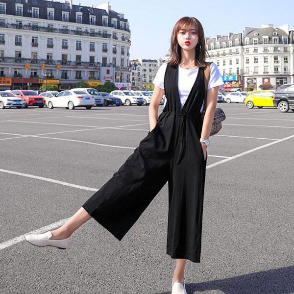 レディース オールインワン 半袖 Tシャツ サロペットパンツ 2点セット ウエスト 紐付き アンクル丈 着痩せ ゆったり カジュア...