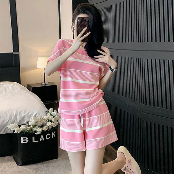 レディース ストライプ 半袖 ショートパンツ 2点セット 伸縮性 薄手 ウエストゴム ルームウェア 部屋着 ゆったり 体型カバー ...