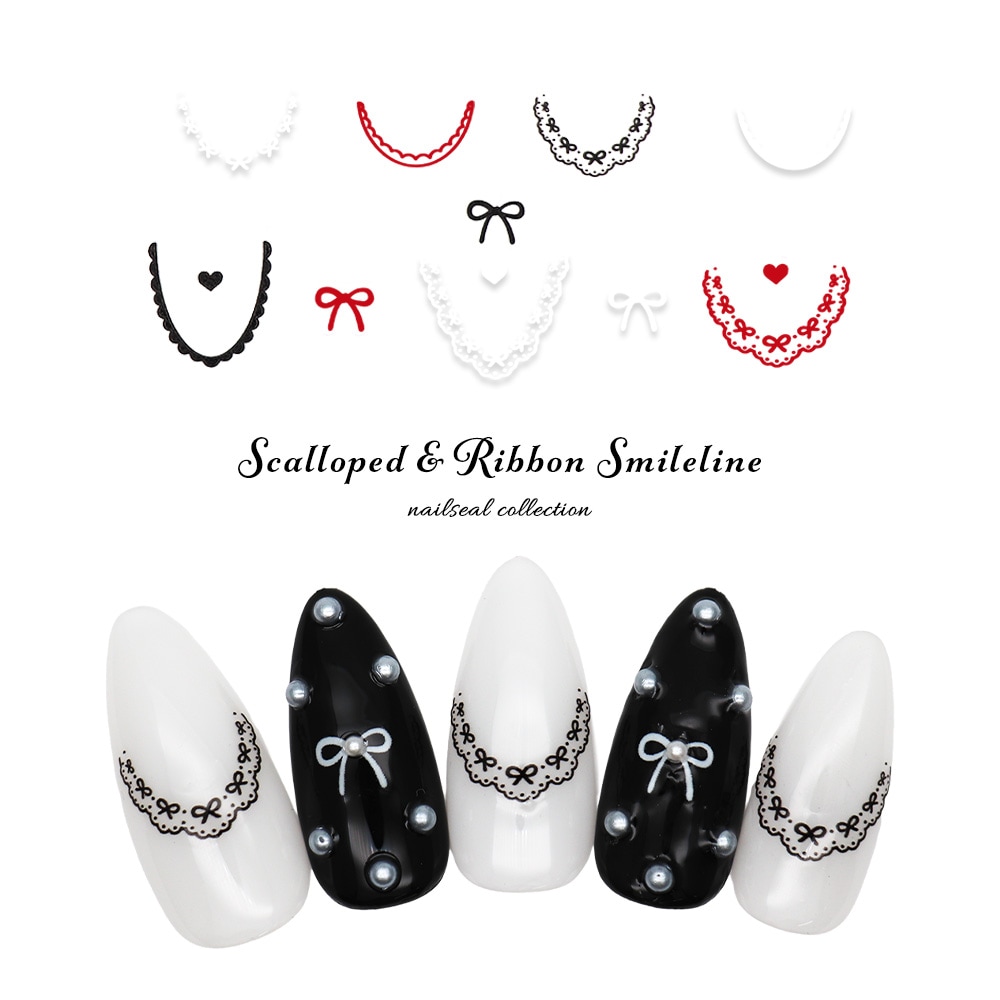 【ネコポス送料無料】ネイルシール スカラップ&リボンスマイルラインシール [ホワイト/レッド/ブラック] 全3色