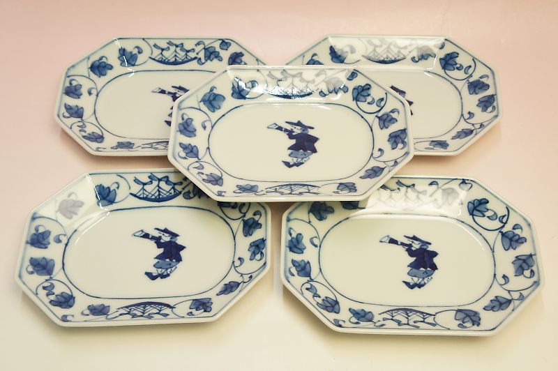 青花 唐草帆船 八角長角取皿揃