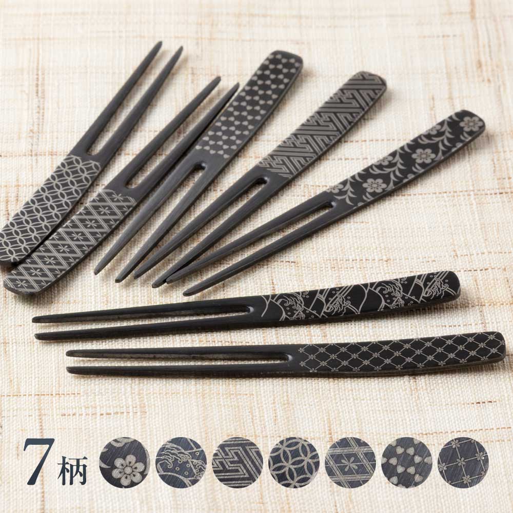 かんざしピックフォーク 黒発色(1本) ステンレス製 和柄 和文様 コンパクトで抜けにくいピックタイプ 新潟県の金属製品 日本製