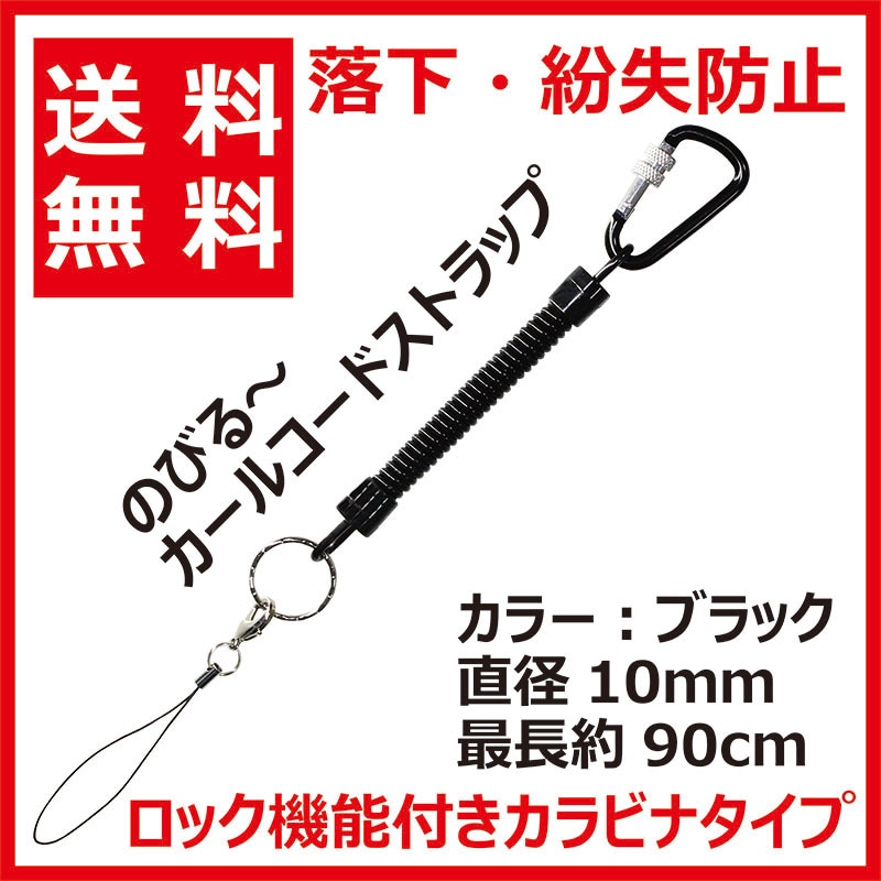 【送料無料 ネコポス便】カールコードストラップ コイルストラップ 伸びる 太めタイプ ロック機能付き カラビナ 大型リング キーチ...