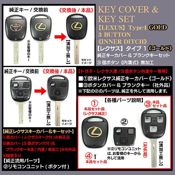 【トヨタ車】ゴールド/レクサスLマーク[タイプ1]レクサスキーカバー&ブランクキーセット[内溝無加工]3個ボタン専用/ブラガ
