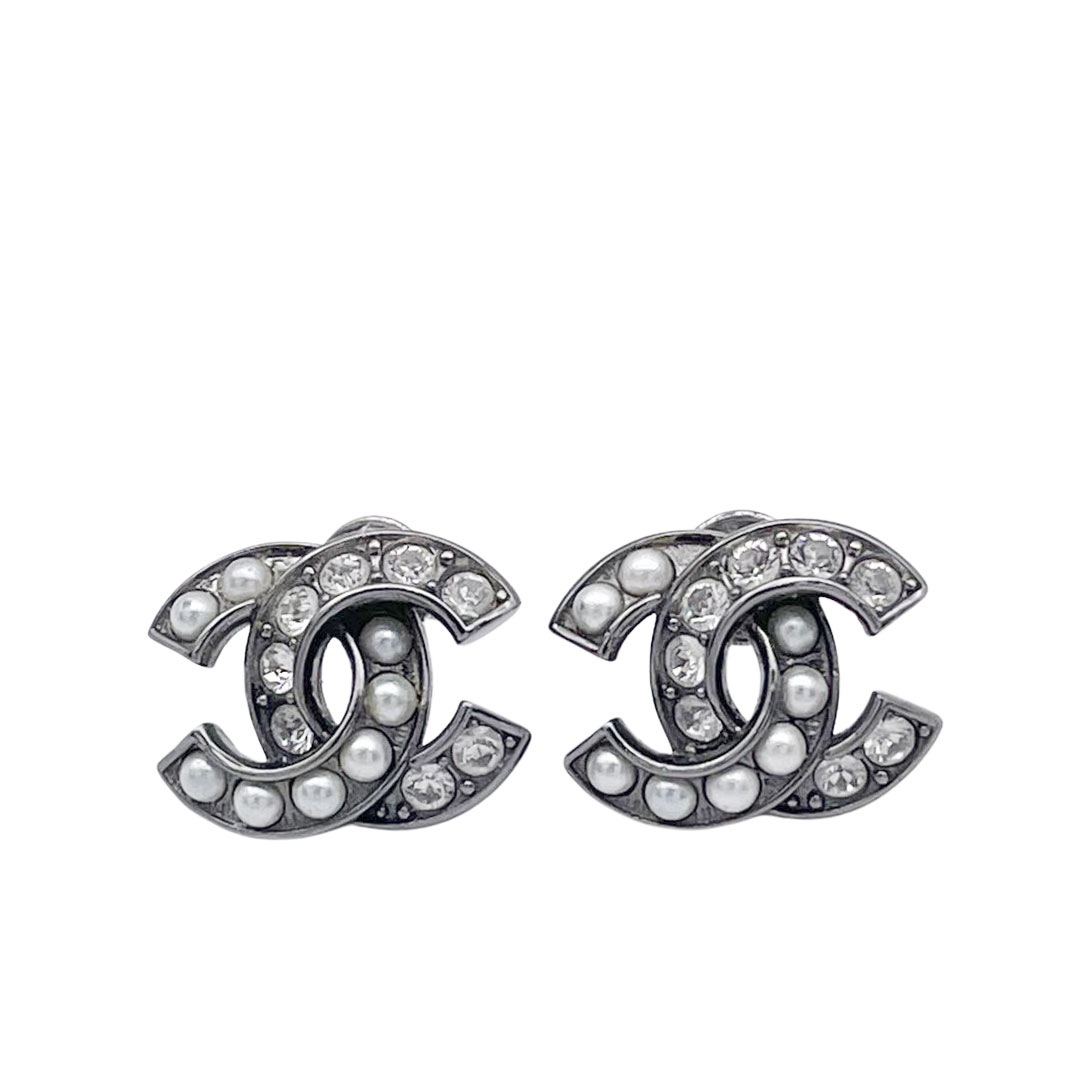 CHANEL シャネル ピアス ココマーク ラインストーン フェイクパール いぶしシルバー B20A