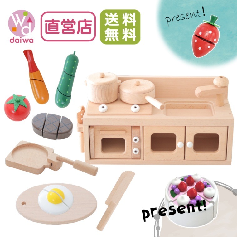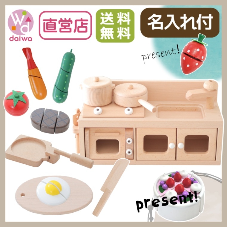 《presentケーキいちご》&《いちご付き》★名入れ付き・ミニキッチン(白)スタートセット《専用BOX*包装不可》 (木のおもち...