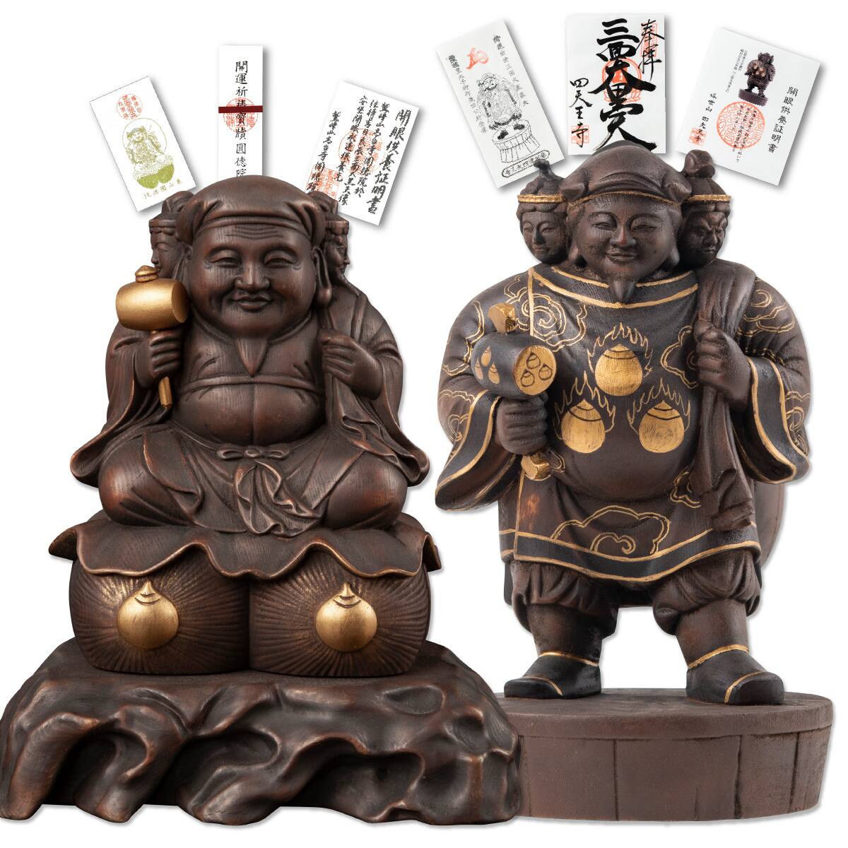 【開眼供養済み】 戦国二大武将の三面大黒天セット。秀吉公と信長公。 ≫木彫像2体セット!