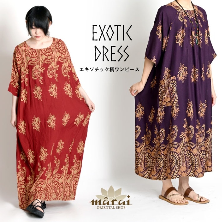 ロングワンピース マキシ丈 総柄 ロング 夏 こなれた大人の佇まい。エキゾチック柄ワンピース 半袖 五分袖 ドルマンスリーブ アジ...
