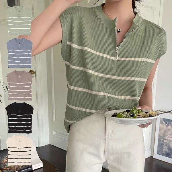 ボーダー柄ハーフジップノースリーブニット