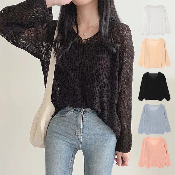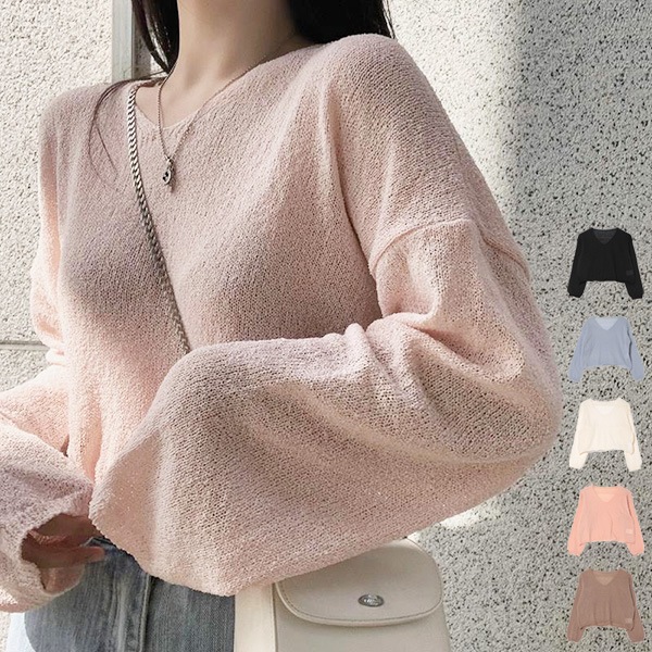 透かし編みゆるVネックニット