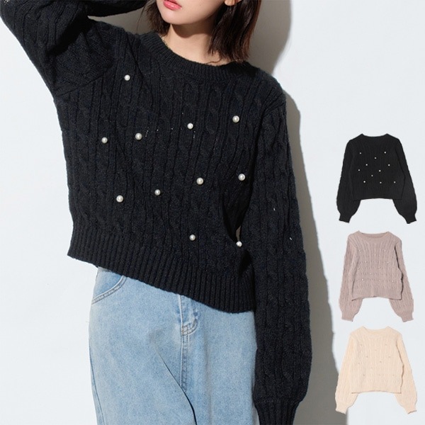 パール付きケーブル編みニットトップス