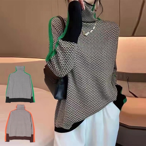 ラインデザインヘリンボーン柄ハイネックニット
