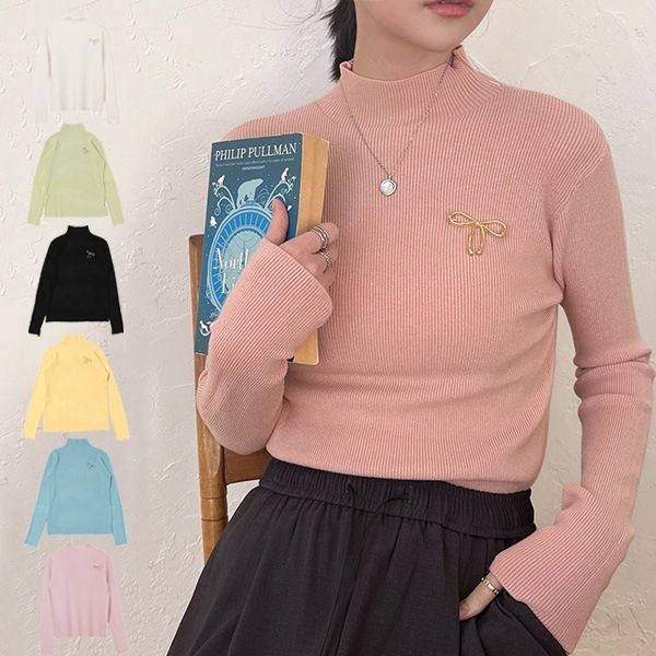 ブローチ付きボトルネックニットトップス