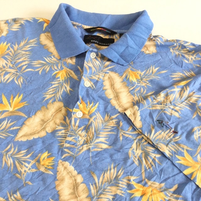 GREG NORMAN アメリカ古着 半袖ポロシャツ メンズ M/水色 ボタニカル柄 総柄 リゾート 南国 アメカジ プリント 古...
