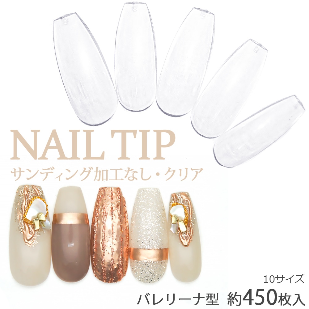 【ネコポス送料無料】ネイルチップ バレリーナ型 クリアネイルチップ サンディング加工なし 透明 約450枚入り (10サイズ)