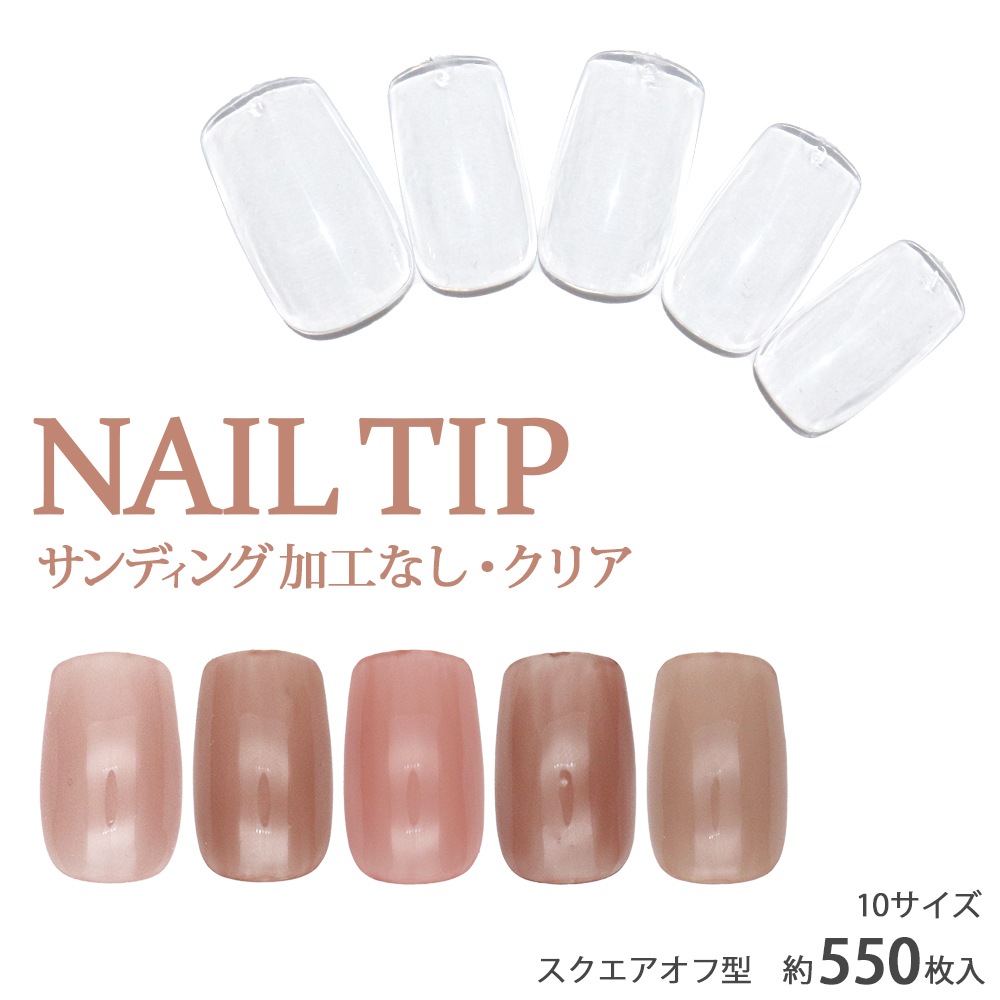 【ネコポス送料無料】ネイルチップ スクエアオフ型 サンディング加工なし クリア 透明 約550枚入り (10サイズ)
