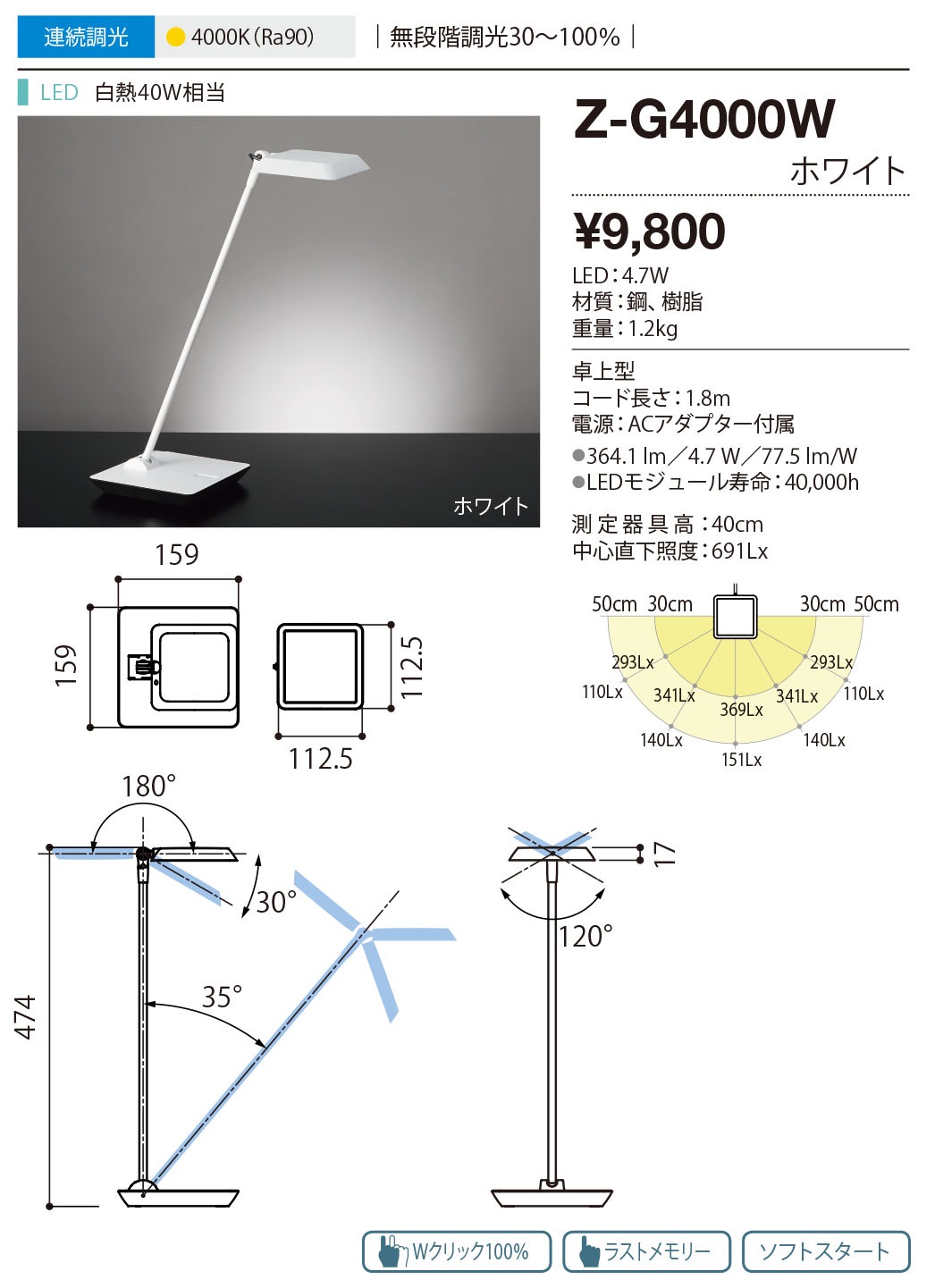 <販売終了品>山田照明 Z-ライト(Z-LIGHT)Z-G4000W(Z-G4000 W) ホワイト LEDデスクスタンド