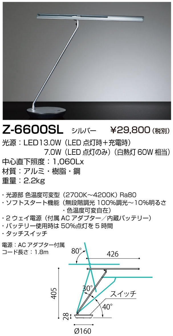 <販売終了品>山田照明 Z-ライト(Z-LIGHT)Z-6600SL(Z-6600 SL) シルバー LEDデスクスタンド