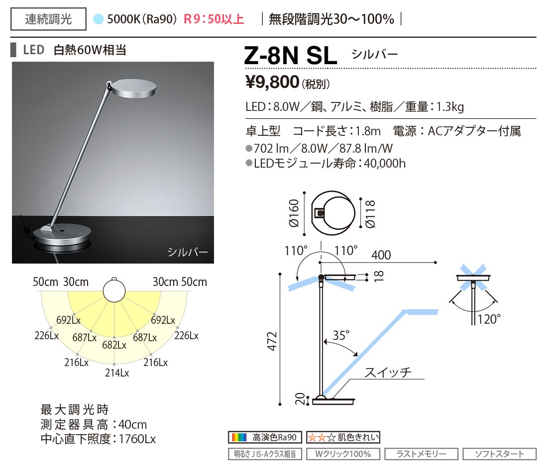 山田照明 Z-ライト(Z-LIGHT)Z-8NSL(Z-8N SL) シルバー LEDデスクスタンド