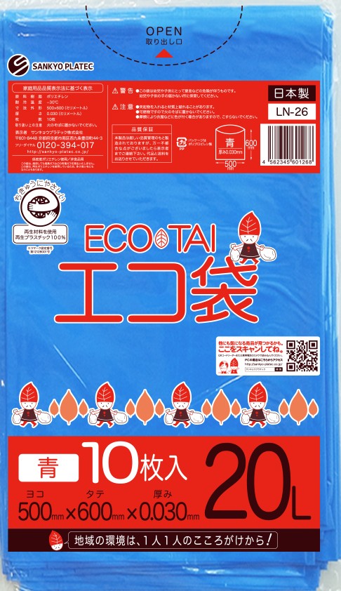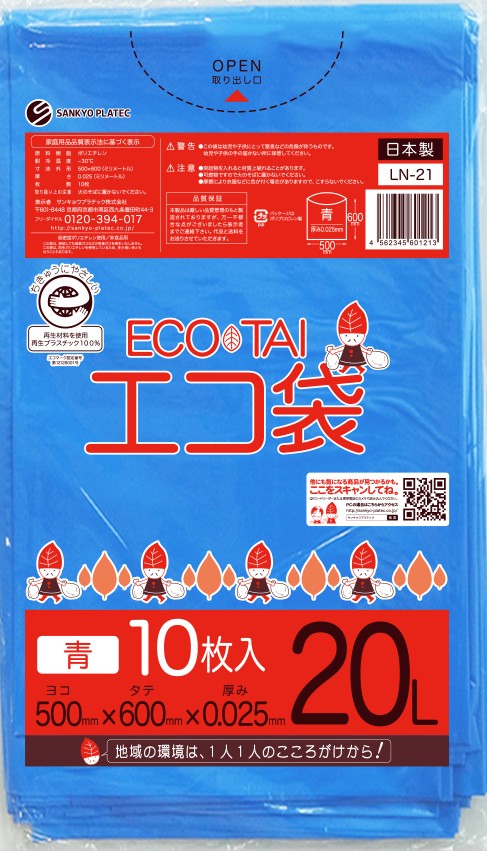 エコマーク付き ゴミ袋 20リットル 幅広タイプ 青 0.030mm厚(10枚×60冊)