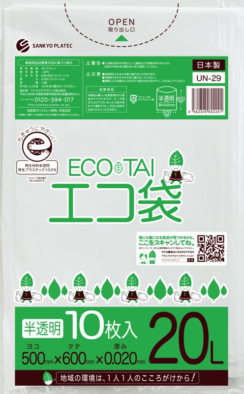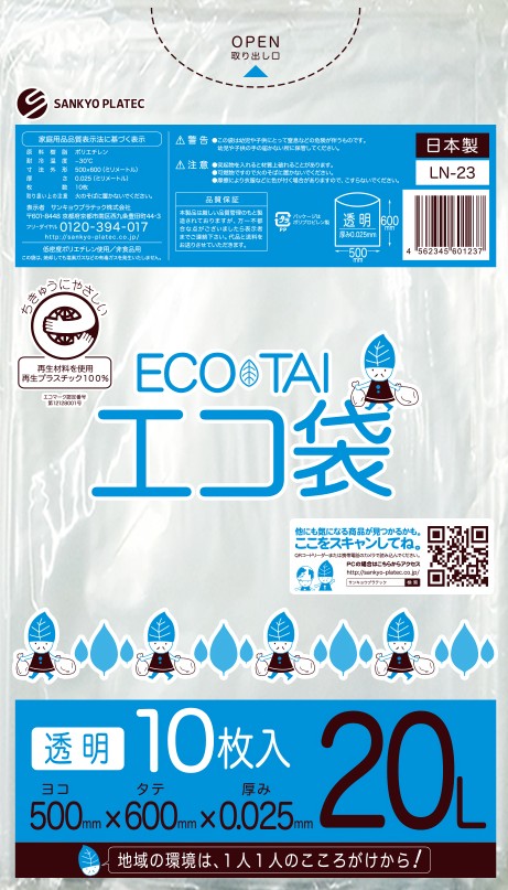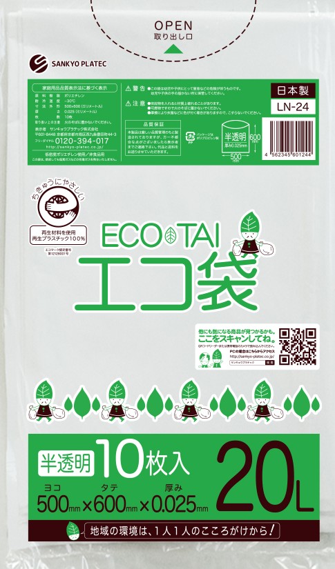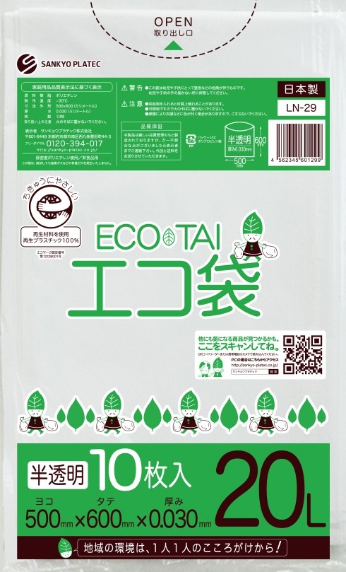 エコマーク付き ゴミ袋 20リットル 薄手 半透明 0.020mm厚(10枚×60冊)