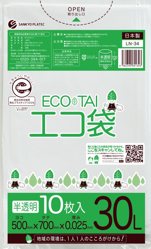 エコマーク付き ゴミ袋 30リットル 半透明 0.030mm厚(10枚×100冊)