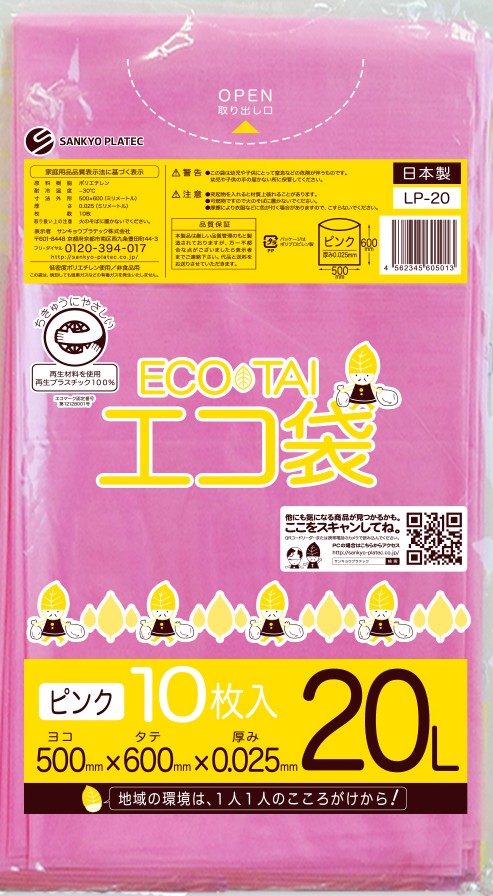 エコマーク付き ゴミ袋 20リットル ピンク 0.025mm厚(10枚×100冊)
