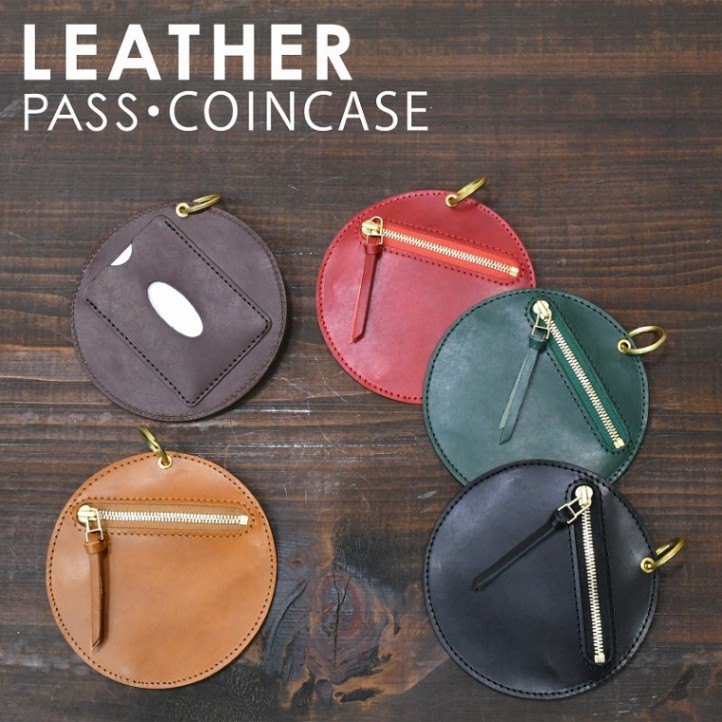 名入れ 刻印付き ヌメ革 パスケース コインケース 小物入れ 円形 ギフト ICケース 真鍮キーホルダー