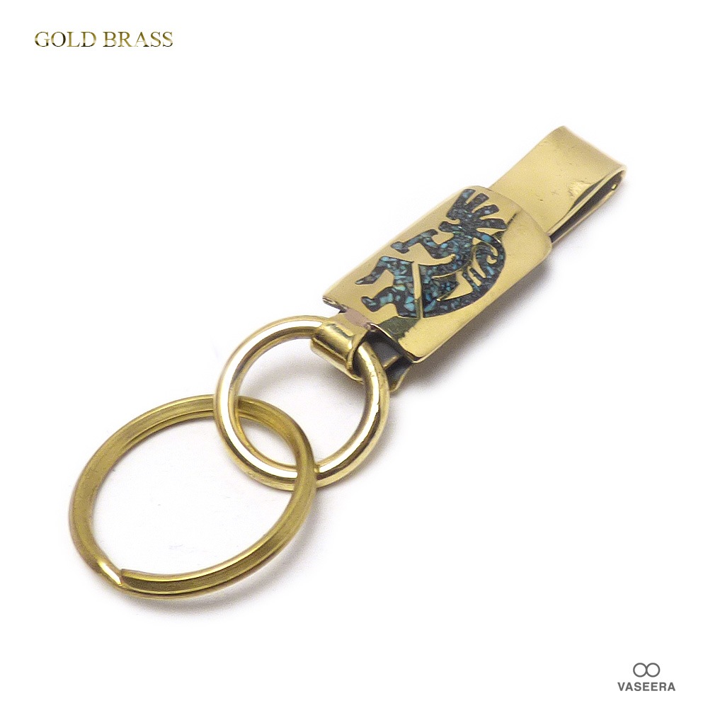 ゴールドブラス(真鍮) 精霊ココペリ ターコイズインレイ仕上げ 30mmプレート クリップフック式 キーホルダー 【キーリング ...