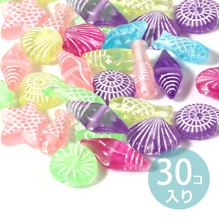 30個入 アソート マリンモチーフ アクリルビーズ クリアカラー 穴約1.5mm / カラフル 透明 ミックス 手芸 プラビーズ ...