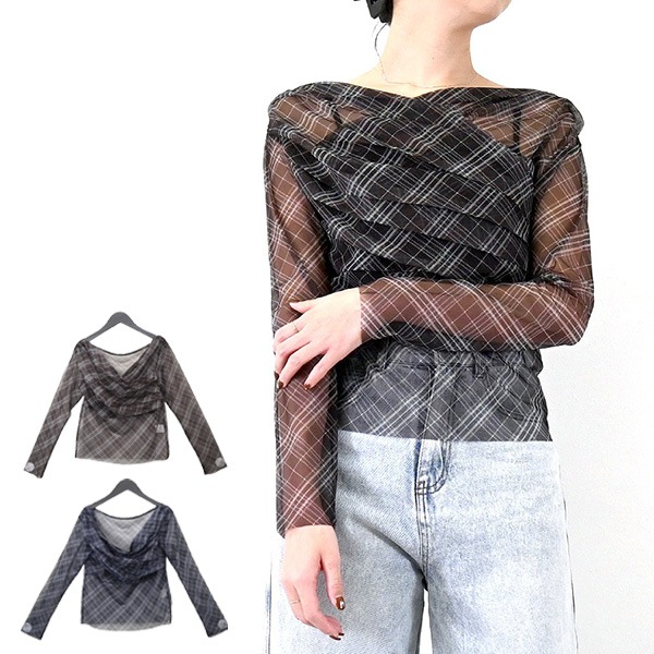 チュールバイアスチェックプリントボートネックプルオーバー