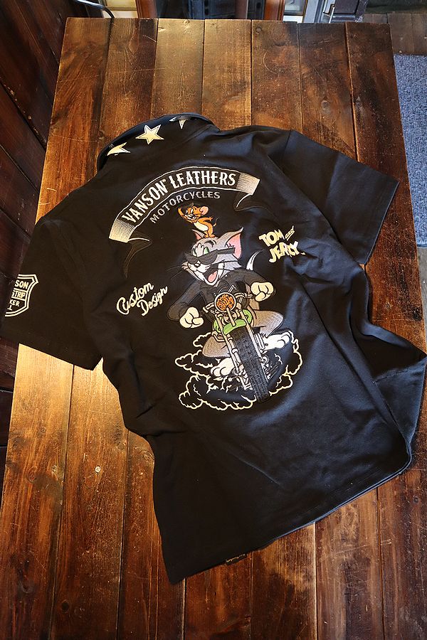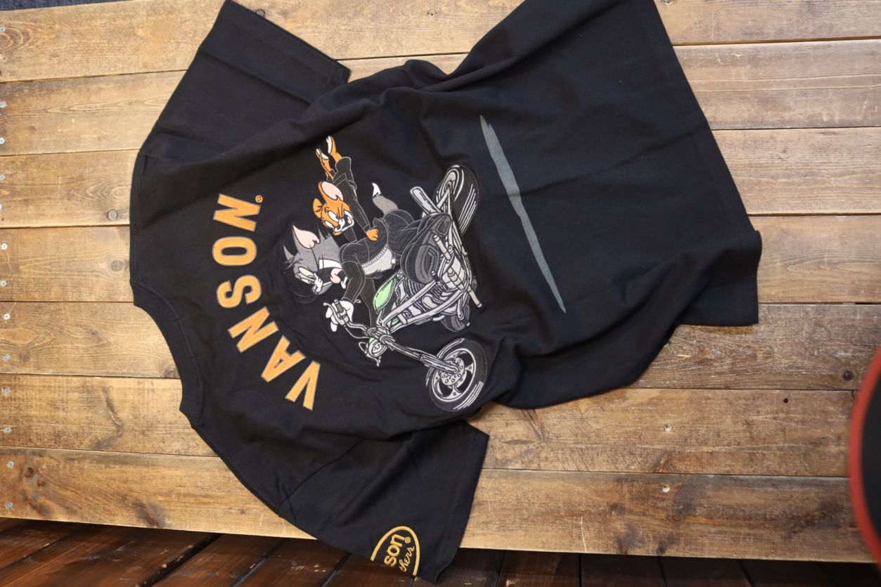 VANSON×Tom and Jerry トムとジェリーコラボ TJV-2511 天竺半袖Tee バイク刺繍 ブラック