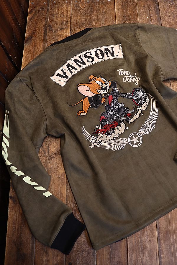 VANSON×Tom and Jerry トムとジェリー TJV-2438 起毛プレーティングクルーネックプルオーバー オリーブ