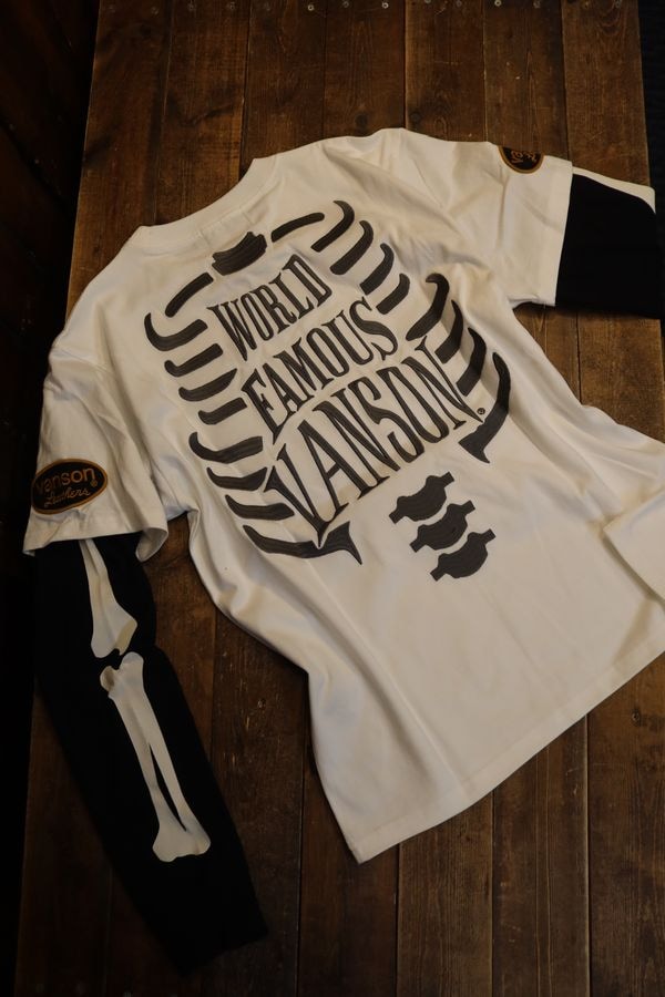 VANSON バンソン NVLT-2511 フェイクロンTee ボーン柄 重ね着風 刺繍長袖Tシャツ オフホワイト